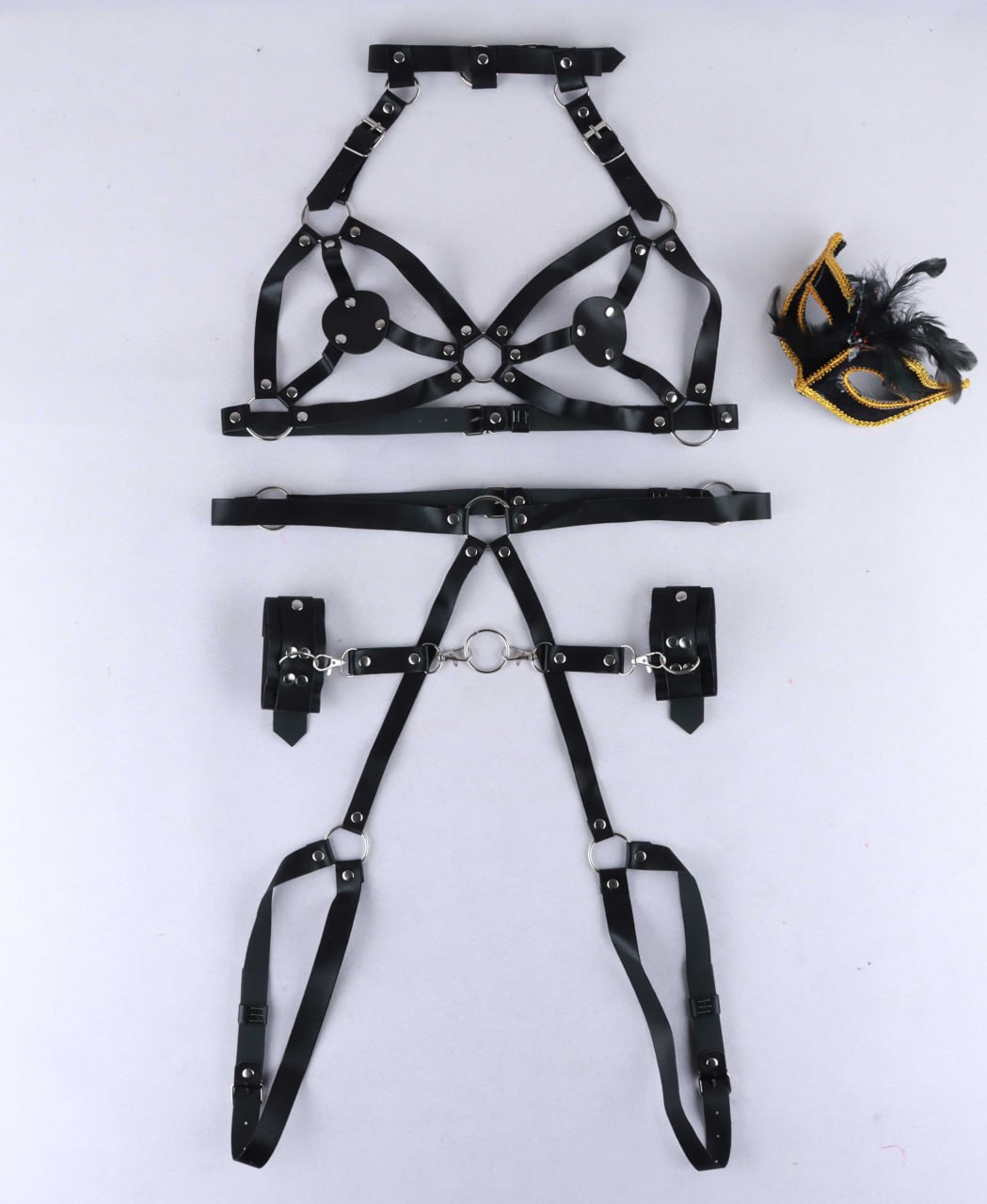 دو عدد تسمه دور پا، سوتین چوکر دار، کمربند، دو عدد رابط کوتاه، دو عدد دستبند