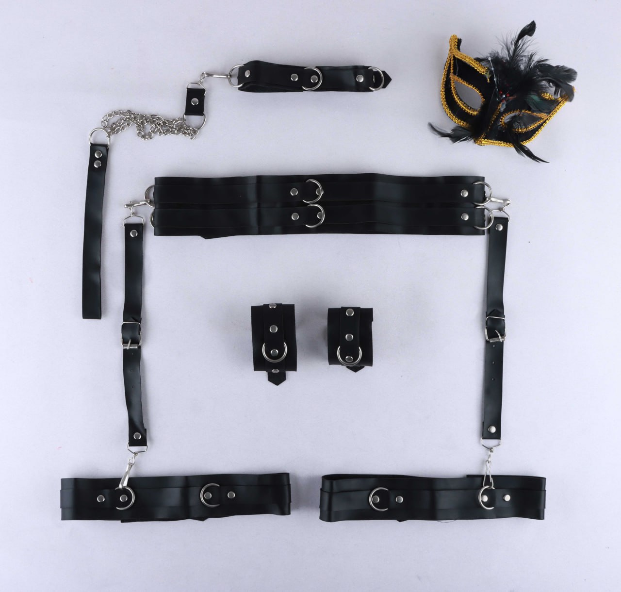 کمربند، دو عدد تسمه دور پا، دو عدد دستبند، یک عدد چوکر، زنجیر